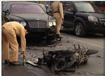 Tại hiện trường, chiếc xe máy do nam thanh niên điều khiển nằm cách chiếc xe Bentley vài mét, đầu bị vỡ tan, nhiều mảnh vỡ bắn tung tóe trên đường. Còn đầu góc trái và bình nước làm mát của xe Bentley cũng bị vỡ.