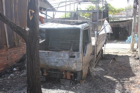 Bà con tại đây thuật lại, trong lúc mọi người đang sinh hoạt b́nh thường bỗng nghe một tiếng nổ khá lớn. Chiếc xe tải biển kiểm soát 54V- 8707 của ông Ngô Văn Vinh đậu trên mảnh đất trống bên cạnh đống phế liệu toàn vỏ xe bốc cháy dữ dội.