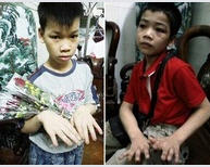 Cháu Nguyễn Văn Dũng và Trần Văn Nam với mười đầu ngón tay bầm dập, lở loét sau khi bị tên Châu dùng thuốc lá đang cháy chích vào.