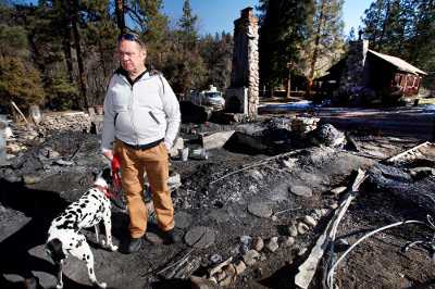 Ông Rick Heltebrake và con chó đến xem đống tro tàn của căn cabin, nơi xác của Dorner được tìm thấy. Ông là người cuối cùng bị Dorner cướp xe hơi. (Hình: AP/Nick Ut)