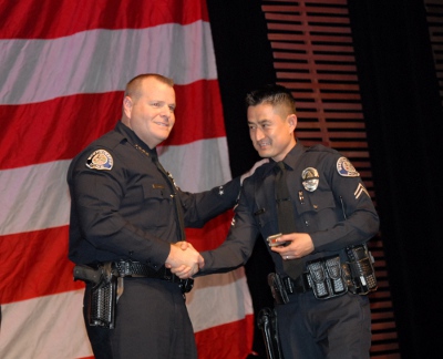Cảnh Sát Trưởng Kevin Baker nhường cho Trung Úy Tim Vũ để trao giải thưởng cho cảnh sát viên Phương Phạm, người cứu sống một bà cụ té xuống hồ tắm hồi Tháng Tám, 2012.