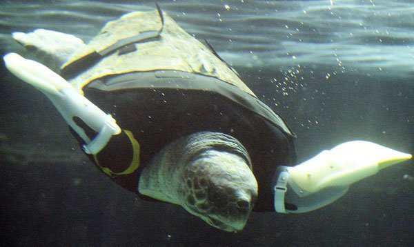 Chú rùa biển tên Y-u, 25 tuổi, cư dân của Thủy cung Thành phố Kobe đã có một bộ phận giả lắp trên mình. Đó là chiếc vây trước bị cá mập - hung thần của biển cả tấn công và đớp cụt mất.