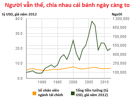 Trong khi đó, tổng tiền thưởng tăng từ 4,1 tỷ USD lên 20,1 tỷ USD. Cả ngành tài chính lẫn lợi nhuận của nó đều tăng trưởng cùng nền kinh tế, tức khoảng gấp đôi so với năm 1987. Nhưng số nhân viên ngân hàng th́ không.