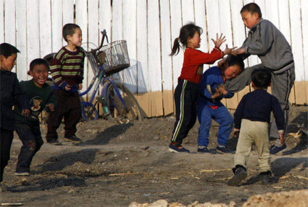 Trẻ em Triều Tiên chơi đùa bên sông Yalu. Ảnh: AP.