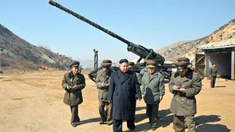 Ông Kim trong một chuyến thị sát đơn vị pháo binh nước này. (Ảnh: Reuters)