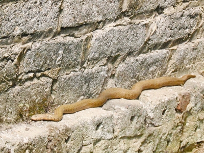 Theo đám đông xúm xít quanh miệng hang chúng tôi nhận thấy từ trong hang nhỏ ở chân tường, một chú rắn màu nâu vàng, dài khoảng 80 cm với cái đầu nhỏ từ từ trườn lên. Nhiều người mang máy điện thoại ra quay, chụp ảnh. Rắn lặng lẽ ḅ ra và nằm dài trên bức tường.