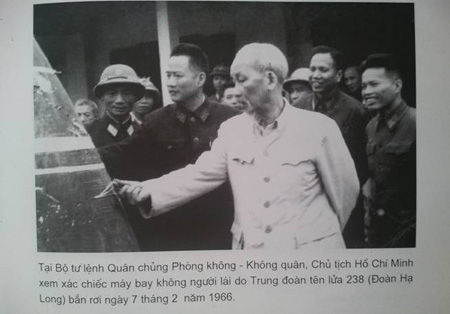 Bác Hồ xem xác máy bay UAV tại Bộ tư lệnh PK-KQ. (Ảnh Tư liệu)