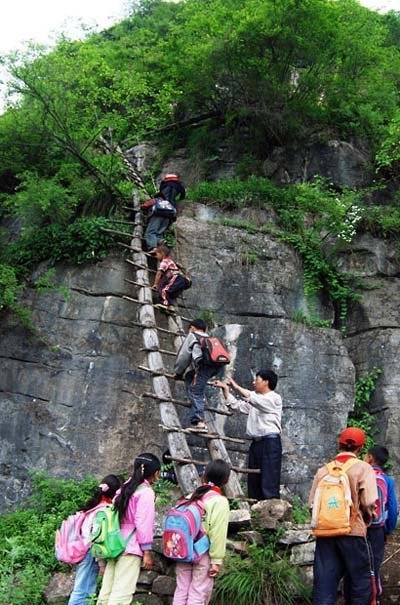 Thầy giáo Li Guilin giúp học sinh của mình trèo lên một cái thang bằng gỗ để tới được ngôi trường nằm trên một vách đá cao 2.800m so với mặt nước biển tại huyện Gangluo, tỉnh Tứ Xuyên, Trung Quốc. Được biết, các em học sinh ở đây sẽ ở lại trường cả tuần trước khi lặp lại hành trình đầy nguy hiểm này để trở về nhà vào ngày nghỉ.