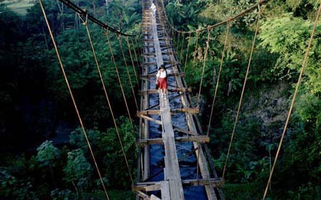 Cây cầu chỉ có 1 tấm ván ở giữa được các học sinh tại ngôi làng Suro và Plempungan tỉnh Java, Indonesia sử dụng như một lối tắt để tới trường nhanh hơn.