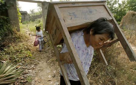 Một phụ nữ phải vác bàn trong khi bé gái đi sau cầm ghế để tới trường học tại Macheng, tỉnh Hồ Bắc (Trung Quốc), nơi các học sinh tiểu học phải tự mang theo bàn ghế đến lớp.