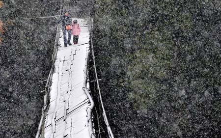 Zhao Jihong và cô con gái 4 tuổi Zi Yi phải vượt qua một cây cầu đã bị nghiêng hẳn sang một bên để tới được trường mầm non tại Dujiangyan, tỉnh Tứ Xuyên (Trung Quốc). Cây cầu gỗ này là gắn kết duy nhất giữa ngôi làng Shawan với thế giới bên ngoài. Tuy nhiên nó đã bị phá hủy trong trận lũ và dân làng vẫn bất chấp nguy hiểm để đi qua.