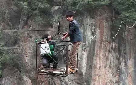 Để tới trường mỗi ngày, những em nhỏ sống tại ngôi làng Decun ở tỉnh Quý Châu (Trung Quốc) phải vượt qua một thung lũng sâu hàng trăm mét trên chiếc cáp treo tự chế.