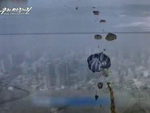Ảnh cắt từ video tuyên truyền Triều Tiên trong đó chỉ rõ, quân đội nước này nhảy dù tấn công Hàn Quốc.