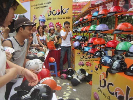 Hàng ngh́n người kéo đến các khu vực công cộng như công viên Thống Nhất, đường Trần Nhân Tông, quận Hai Bà Trưng, Vườn hoa Hàng Đậu... để tham gia đổi mũ bảo hiểm cũ, mũ giả, lấy mũ bảo hiểm mới chất lượng cao do UBATGT QG phát động từ ngày 23/3 đến 25/3/2013.