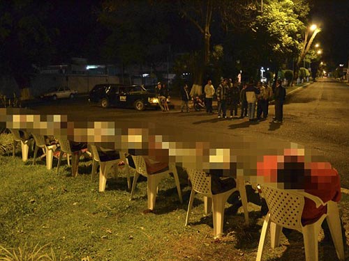 (NLĐO) - Thi thể 7 người đàn ông Mexico bị bắn vào đầu được đặt trên những chiếc ghế nhựa tại Mexico mới đây, trên ngực của họ có khắc lời cảnh báo.