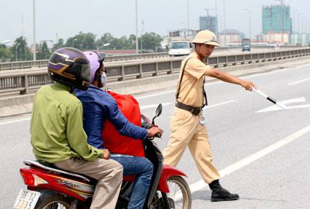 Một trường hợp vượt đèn đỏ bị cảnh sát giao thông yêu cầu dừng xe xuất trình giấy tờ trên phố Trần Duy Hưng, Hà Nội ngày 10-11-2012.