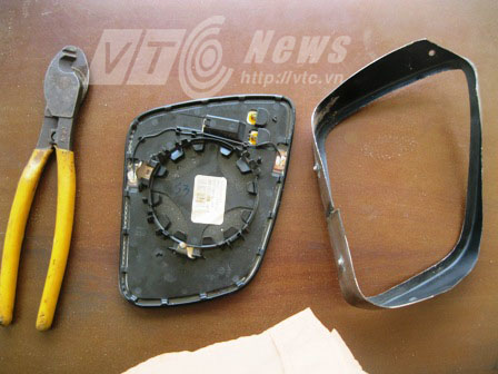 Kiềm cắt và chiếc gương chiếu hậu bị bể khi bọn cướp chống trả hiệp sĩ Minh Tiến. Ảnh: Phan Cường