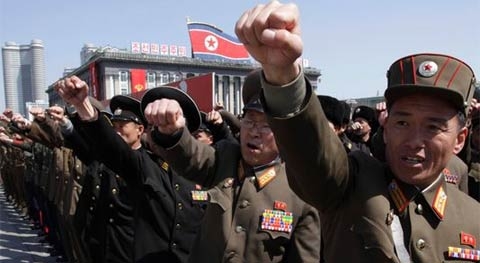 Các sĩ quan quân đội Triều Tiên giơ cao nắm đấm khi hô khẩu hiệu trong một cuộc mít-tinh tại Quảng trường Kim Il-sung, B́nh Nhưỡng.