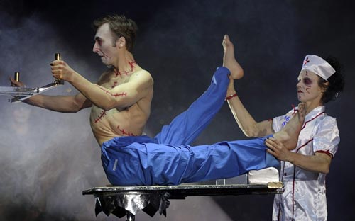 Hai nghệ sĩ xiếc làm khán giả đứng tim với màn biểu diễn cô y tá vặn veo tử thi trong buổi công chiếu của “Gánh xiếc kinh dị” ở Essen – Đức. Ảnh: EPA