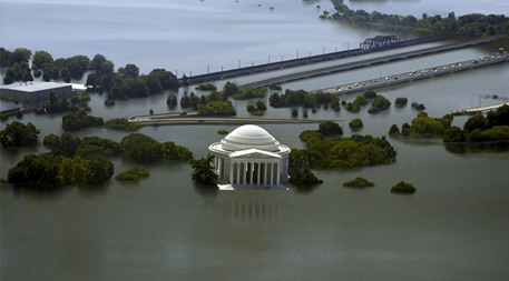 Đài tưởng niệm Thomas Jefferson ở thành phố Washington, Mỹ ngày nay (trên) và khi mực nước biển dâng thêm 7,5 m trong tương lai (dưới).