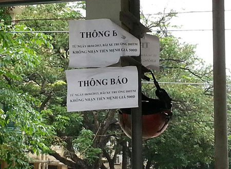 “Từ ngày 08/4/2013 bãi gửi xe không nhận tiền mệnh giá 500 đồng” là thông báo được dán tại bãi gửi xe của đại học Thương mại.