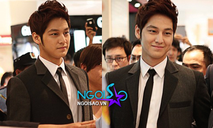 - Sau chuyến bay đáp xuống Tp.HCMm ngay chiều nay Kim Bum đã tranh thủ tham gia họp báo bộ phim mới của anh tại một cụm rạp ở Q.7.