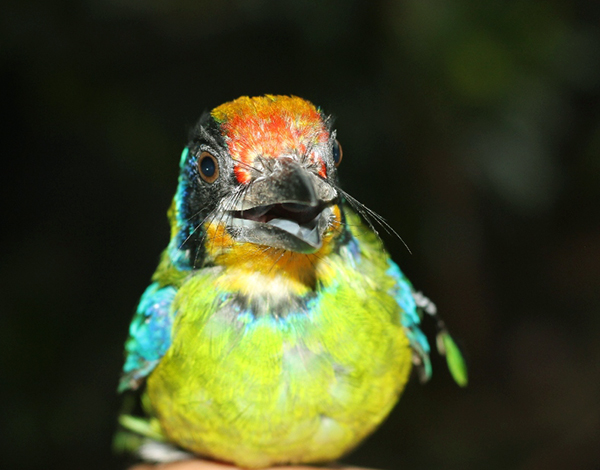 Theo quan sát, đây là con chim dài khoảng 20cm, có nhiều màu sắc. Con chim chưa mọc đủ lông cánh và lông đuôi. Phần lưng của chim có màu xanh lá cây, phần cánh và hai bên má có màu xanh lá cây kết hợp xanh da trời, phía trên đỉnh đầu có màu đỏ gạch kết hợp màu vàng. Chân màu nâu xám có 4 móng, 3 móng hướng về phía trước và 1 móng hướng phía sau. Mỏ chim màu nâu dài khoảng 3cm rất cứng.