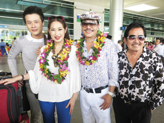 Ca sĩ Ý Lan và Tuấn Anh (đeo vòng hoa) tại sân bay hôm qua - Ảnh: T.X