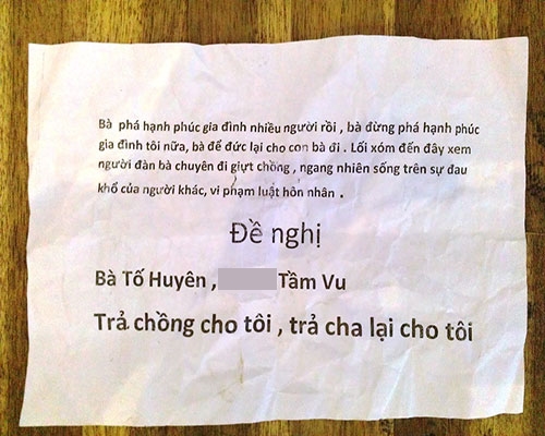 Cụ thể: “Bà phá hạnh phúc gia đ́nh nhiều người rồi, bà đừng phá hạnh phúc gia đ́nh tôi nữa, bà để đức lại cho con bà đi.Lối xóm đến đây xem người đàn bà chuyên đi giựt chồng, ngang nhiên sống trên sự đau khổ của người khác, vi phạm luật hôn nhân…”.