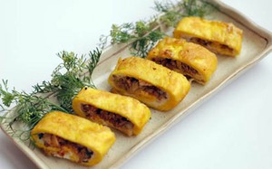 Làm nóng dầu trong chảo, đổ lòng đỏ vào trước đến khi hơi se mặt thì đổ lòng trắng lên trên, sau đó cho kim chi vào rồi cuộn lại, chiên vàng 2 mặt là xong rồi.
