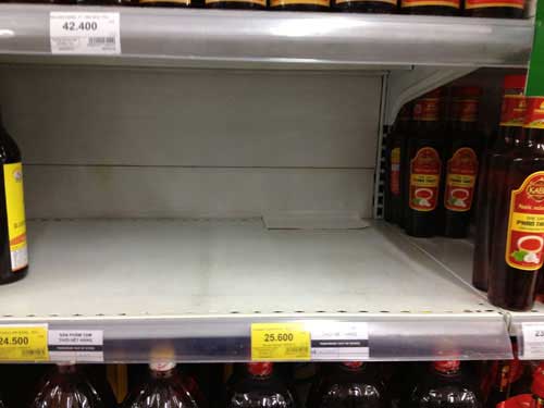 Theo đó, từ sản phẩm thức uống (các loại trà), trái cây sấy, thực phẩm chế biến (nhiều nhất là các loại ḿ, phở ăn liền), nước chấm, gia vị, cho đến các loại nước xả vải, nước tẩy rửa... đều xảy ra hiện tượng hết hoặc sắp hết hàng.