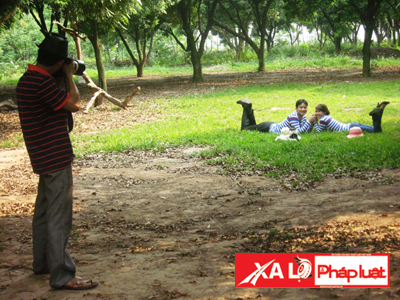 | Các cặp đôi tạo dáng ở vườn nhăn chân cầu Vĩnh Tuy |