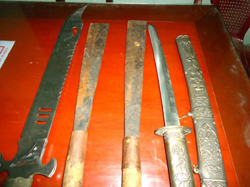 Tang vật thu giữ gồm 4 cây mã tấu, 1 cà vẹt xe ô tô, do Đặng Thị Cao Lý (Q.Hải Châu, TP Đà Nẵng) làm chủ phương tiện cùng nhiều tang vật khác liên quan đến vụ án.