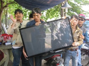 2 tên trộm tivi (giữa) bị "hiệp sĩ" Nguyễn Thanh Hải (bìa trái) và đồng đội Hồ Duy Tân (bìa phải) tóm gọn cùng tang vật và phương tiện đi gây án.