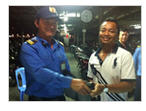 Nhân viên bảo vệ cảng tàu cánh ngầm (trái) trả lại túi xách chứa nhiều tài sản, giấy tờ cho ông Helmy Bin Sulaiman - Ảnh do bến tàu cánh ngầm cung cấp.