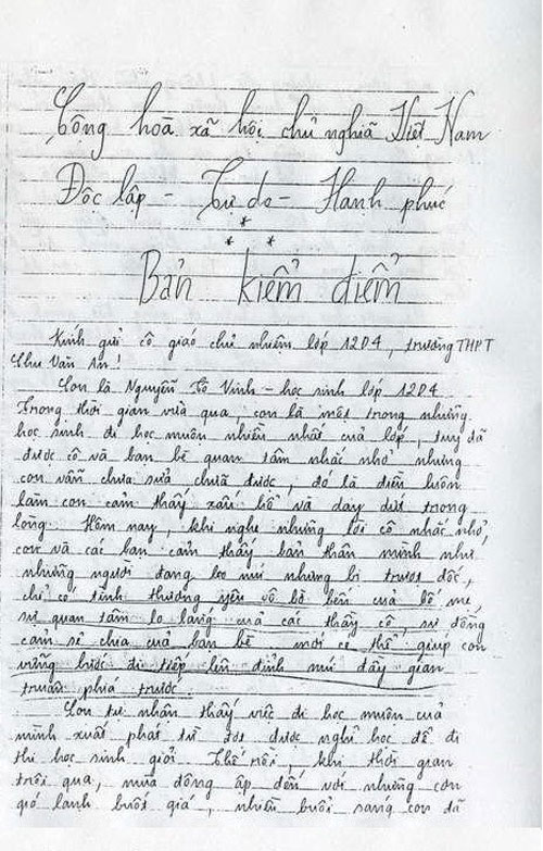 Theo nội dung của bài viết th́ học sinh này tên là Nguyễn Tô Vinh, học sinh lớp 12A4, trường THPT Chu Văn An. Vinh là một học sinh giỏi nhưng do đi học muộn 6 buổi trong 1 học kỳ nên đă bị hạnh kiểm khá. Tô Vinh đă rất hối hận và viết bản kiểm điểm này gửi đến cô giáo chủ nhiệm của ḿnh.