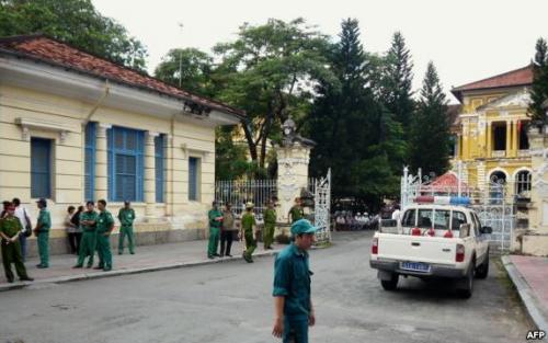 Công an trước cổng Tòa án Nhân dân TPHCM.