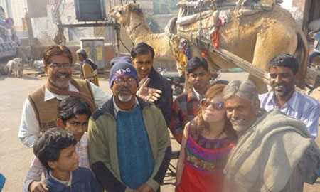 Phương Mai (thứ 3 từ phải sang) với những người dân nghèo Ấn Độ.. |