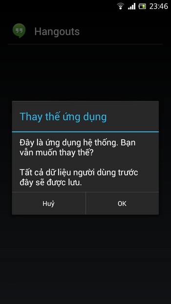 Sau khi download file cài đặt của ứng dụng Hangouts (định dạng apk), kích hoạt file download được trên thiết bị. Một hộp thoại hiện ra hỏi người dùng có muốn thay thế ứng dụng Talk đă có bằng ứng dụng Hangouts mới hay không. Bạn nhấn nút OK, sau đó nhấn nút "Cài đặt" để bắt đầu cài đặt ứng dụng mới