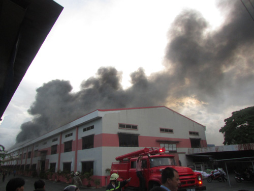 Hàng chục xe cứu hỏa cùng hàng trăm chiến sĩ PCCC đang nỗ lực khống chế ngọn lửa tại công ty chuyên sản xuất giày Shang One (nằm trong Khu công nghiệp Sóng Thần) đường Độc Lập, TX.Dĩ An, T.Bình Dương.