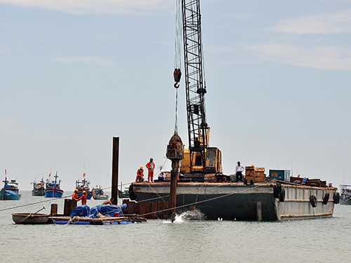 Những ngày này, tại vùng biển thôn Châu Thuận Biển, xã Bình Châu, huyện Bình Sơn - Quảng Ngãi, Công ty TNHH Đoàn Ánh Dương đang đóng cừ, xây đê chắn sóng xung quanh vị trí con tàu chở cổ vật bị chìm.