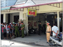 Cảnh sát thẩm vấn những người có liên quan tại sảnh khách sạn Vinh Phong. Ảnh: Ngô Tư