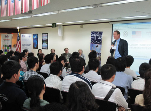 Một viên chức lănh sự Mỹ trao đổi về thủ tục xin visa du học - Ảnh: Trung tâm Giáo dục Mỹ cung cấp |