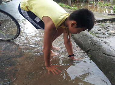 Nước bắt đầu rút, trẻ con rủ nhau bắt cá trên đường.