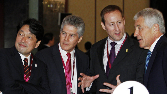 Từ trái sang: các bộ trưởng Quốc phòng Itsunori Onodera (Nhật), Stephen Smith (Úc), Peter MacKay (Canada) và Chuck Hagel (Mỹ) gặp gỡ tại Đối thoại Shangri-La - Ảnh: Reuters