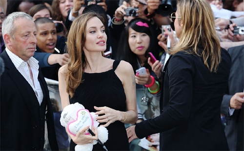 Ange tươi cười trước ống kính phóng viên, ký tặng người hâm mộ và luôn dành cho Brad những ánh mắt trìu mến. Nữ diễn viên vẫn vô cùng gợi cảm và quyến rũ trong bộ đầm đen dài chấm đất hiệu Saint Laurent. Cô trang điểm nhẹ nhàng và để tóc xõa tự nhiên.