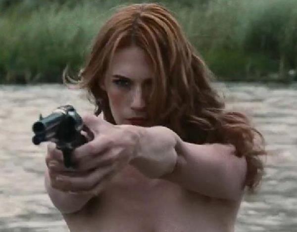 Default January Jones gây choáng với màn ngực trần bắn súng