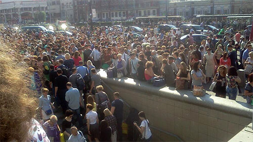 Hàng ngàn người phải sơ tán khỏi ga tàu điện ngầm ở Moscow. Ảnh: Twitter/RT