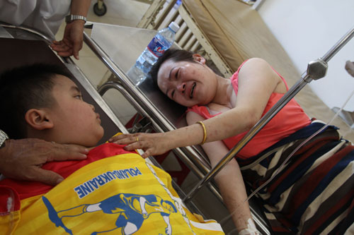 Chị Đỗ Thị Xuân Trang khóc nức nở bên cạnh con trai Đoàn Anh Đức, cả hai mẹ con đều bị thương c̣n con trai đầu chị Trang là Đoàn Hải Nam đă tử vong trong vụ tai nạn này.