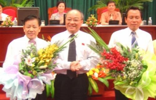 Chủ tịch UBND TP Nguyễn Quốc Triệu chúc mừng hai tân Phó Chủ tịch Hà Nội ngày 13/7/2007 ngay sau khi được bầu.